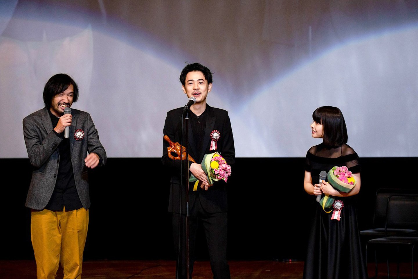 最優秀新進男優賞では、清水尋也さんが「二十歳になった節目の年に初めての映画賞を受賞できて嬉しい」と述べられた後、山戸監督から「清水さんは天才なので、清水さんにしか出来ない役を突き進んで欲しい」と言われて、「大勢の前で天才と言われて気持ちが引き締まりました。これからもより一層頑張ります。」と意気込みを語られました。成田凌さんは「映画界に欠かせない人間になれるようにこれからも精進していきたい」と決意を語られました。ここで『愛がなんだ』の今泉力哉監督がサプライズで登壇されて岸井さん、成田さんを祝福され、役作りのために距離を取ろうとしていた岸井さんの配慮に気づいていなかった点で、成田さんは役のマモルに相通じるところがあると客席の笑いを誘っていました。
