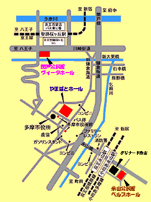 【座席数 543】 〒206 多摩市関戸6-12-1 やまばとホール 【交通アクセス】 ■小田急多摩線/京王相模原線永山駅より徒歩13分 ■京王線聖蹟桜ヶ丘よりバス。 北側デパート1階にあるバス乗り場7番又は8番より多摩市役所を経由する「多摩センター駅」行や「永山5丁目」行で「多摩市役所前」下車。徒歩2分 ■多摩センター駅よりバス。 バスターミナル6番又は7番より多摩市役所を経由する「聖蹟桜ヶ丘駅」行で「多摩市役所前」下車。徒歩2分 |